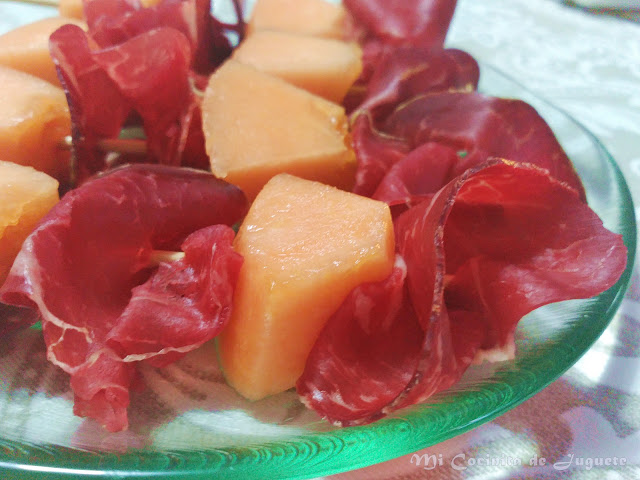 Mira la receta en: http://micocinitadejuguete.blogspot.com.es/2016/08/brochetas-de-melon-con-cecina.html